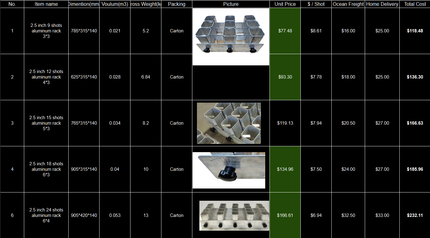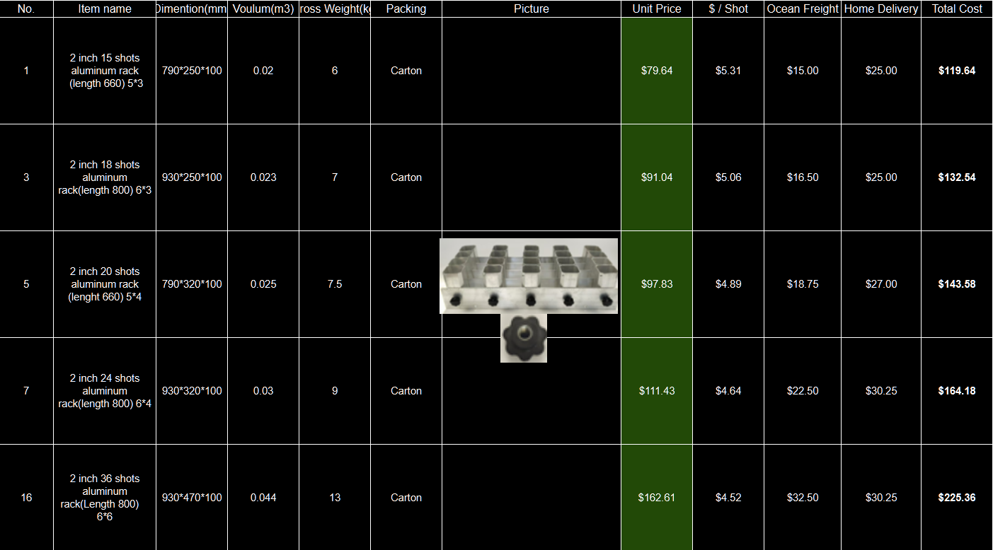 Single shot rack pre-order. Got prices to actually go down a bit need to get order to the factory by January 15th. 50% deposit to guarantee the items you want can’t give these prices and front the money for everyone’s order. Keep in mind the home delivery portion of the shipping would be if you had that unit shipped directly to your house. The rate for shipping to PyroFest will be much less as it will be with other orders.